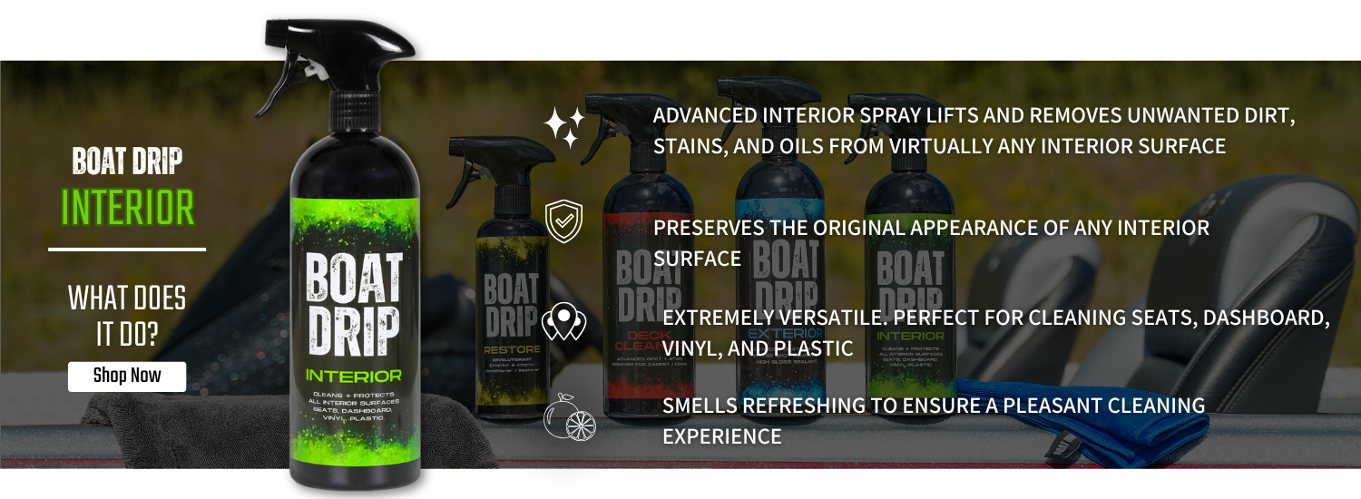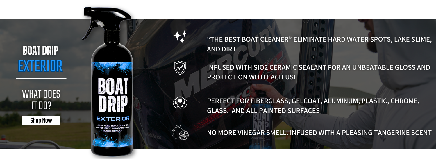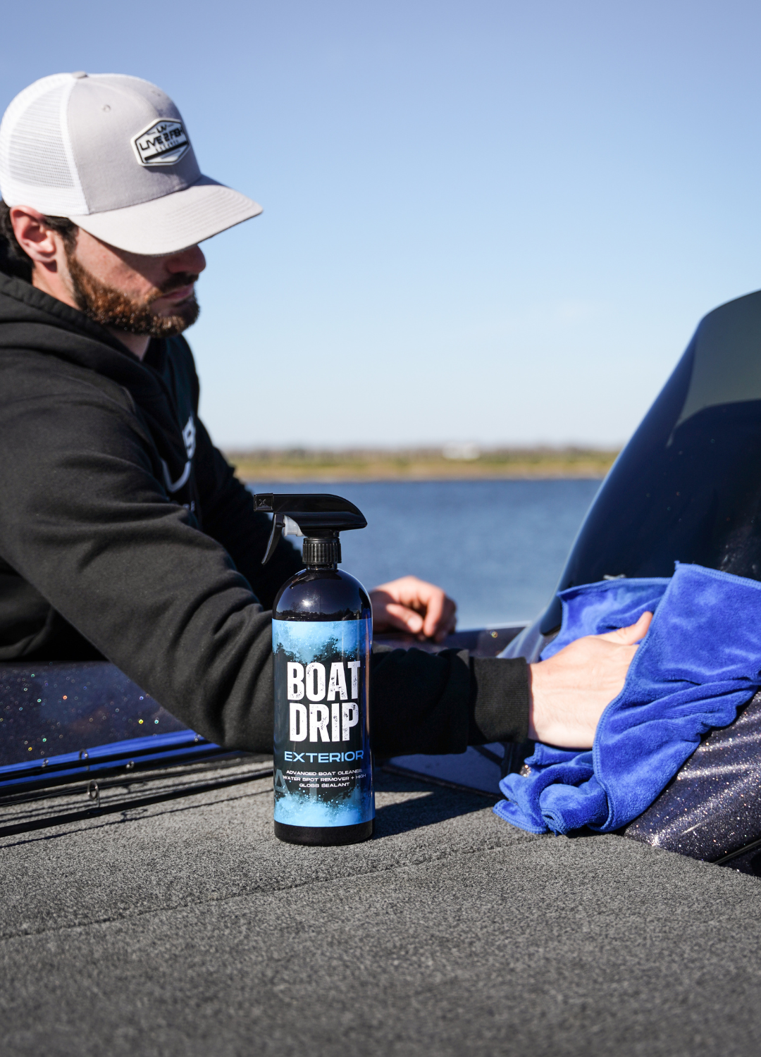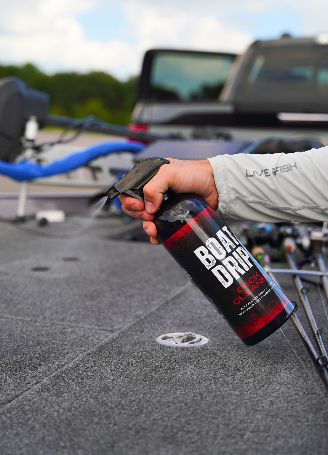 Boat Drip Exterior: Eliminates hard water spots, lake slime, and dirt, perfect for fiberglass, gelcoat, aluminum, plastic, chrome, glass, and all painted surfaces. Restore: Revives your trims, trailer, vinyl, leather, plastic, and rubber, making them look brand new. Deck Cleaner: Tackles the toughest stains with instant results—just spray, work in, and wipe off!